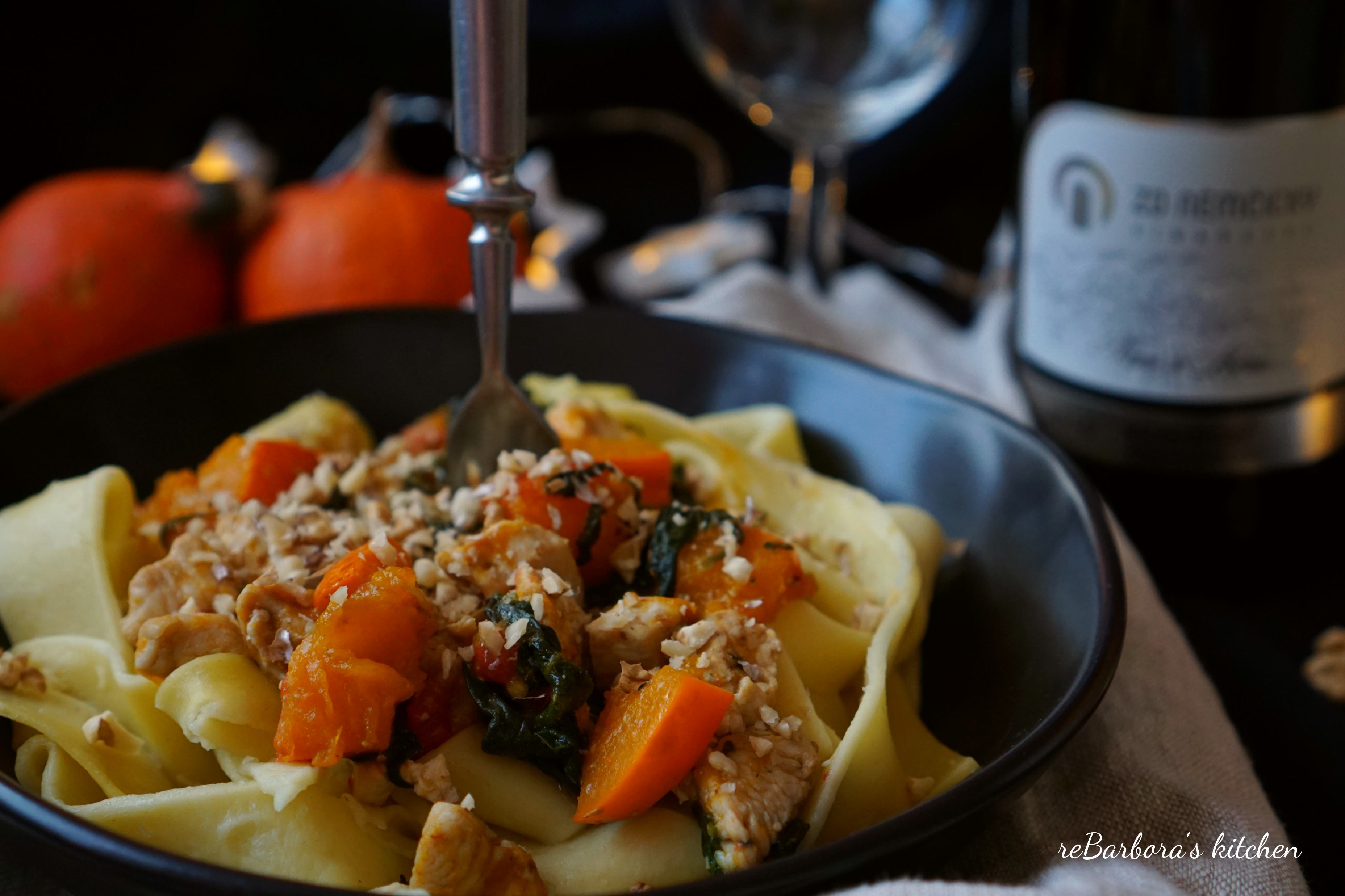 Těstoviny s dýňovo-kuřecí směsí se špenátem, ořechy a dýňovou omáčkou 27.11.201727.11.2017 reBarbora's kitchen Těstoviny s dýňovo-kuřecí směsí se špenátem, ořechy a dýňovou omáčkou | reBarbora’s kitchen