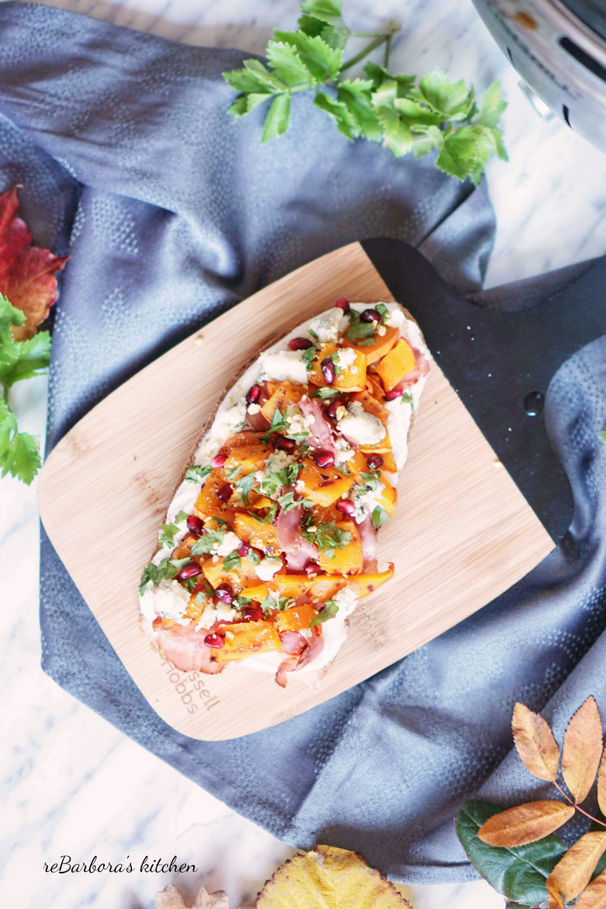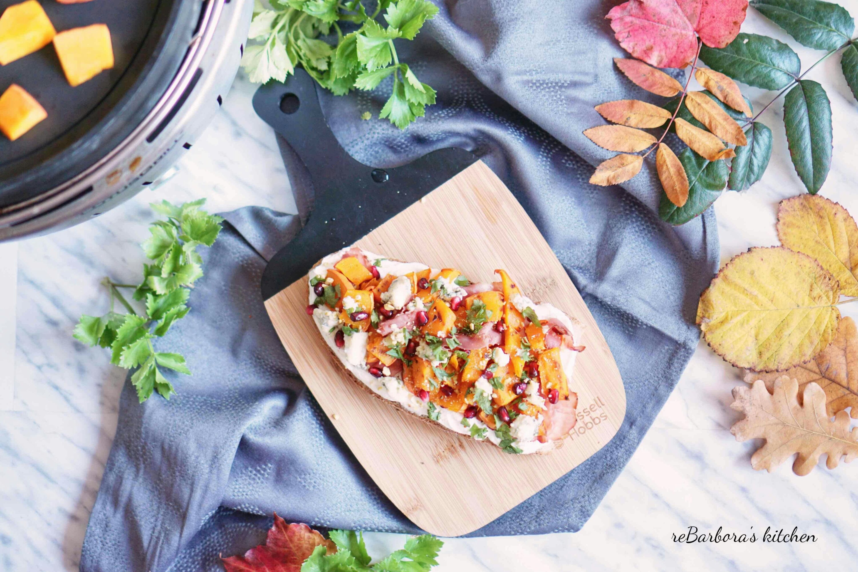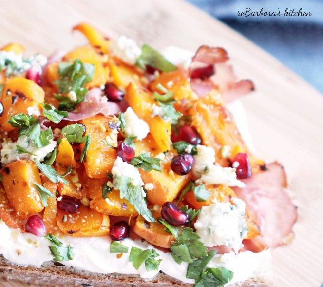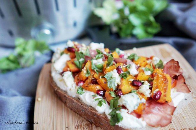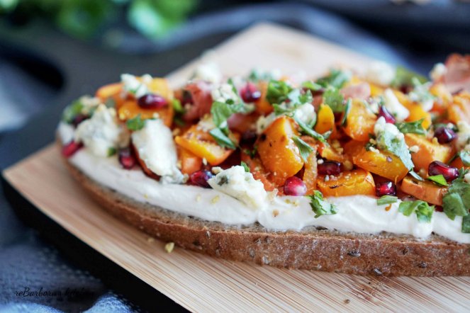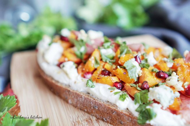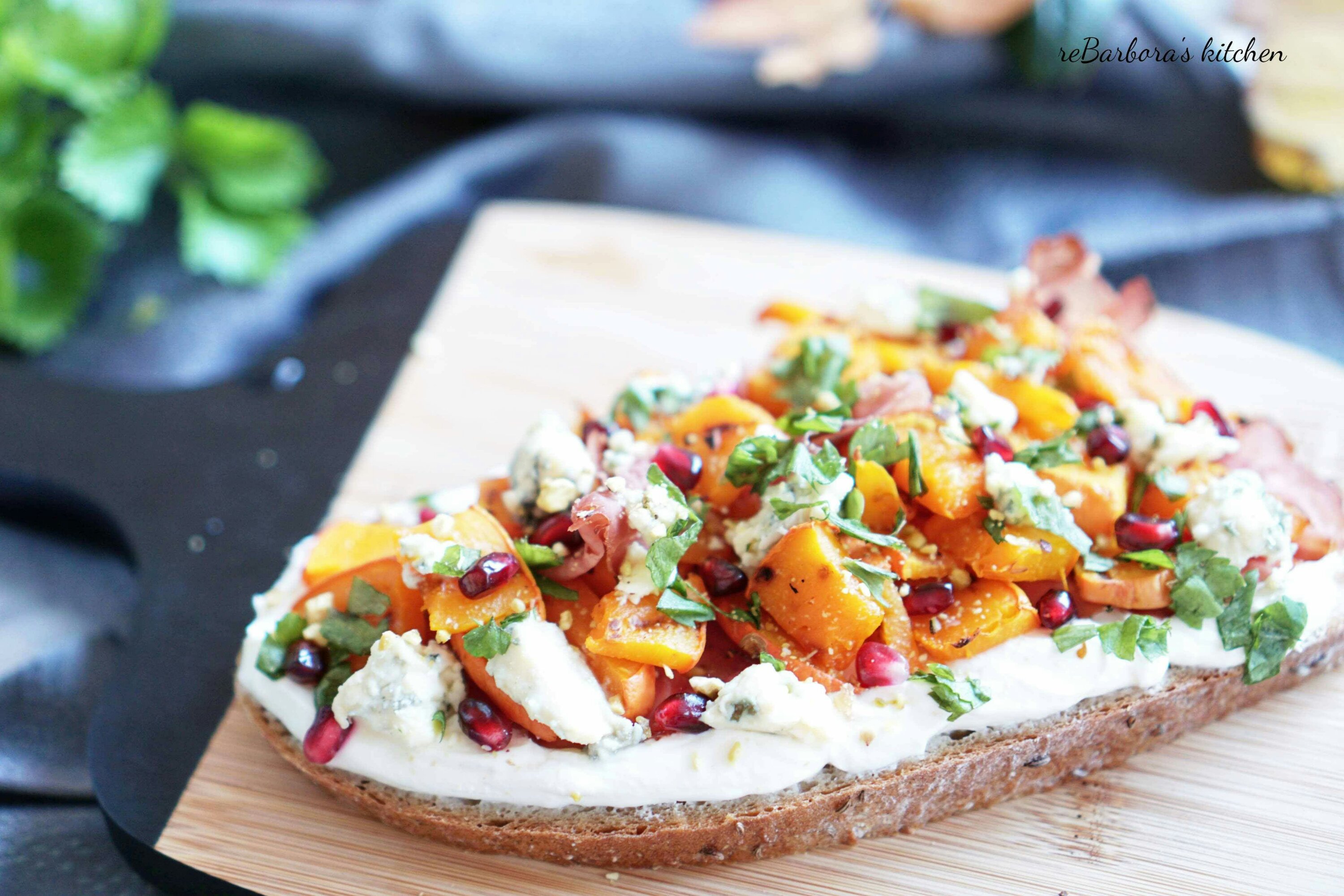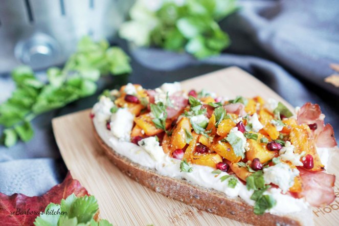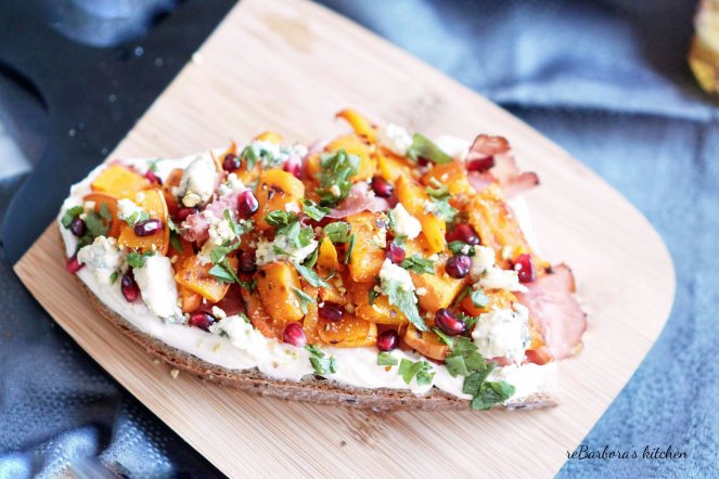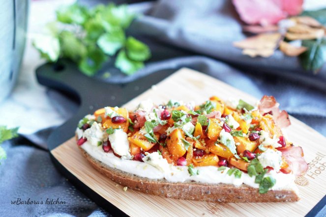 Na opečený chléb naneste připravenou smetanovo-sýrovou pomazánku, plátky šunky, kousky dýně a zbylý plísňový sýr. Posypte bylinkami, nasekanými oříšky (já dala pistáciové) a granátovým jablíčkem. A můžete toust vychutnávat.