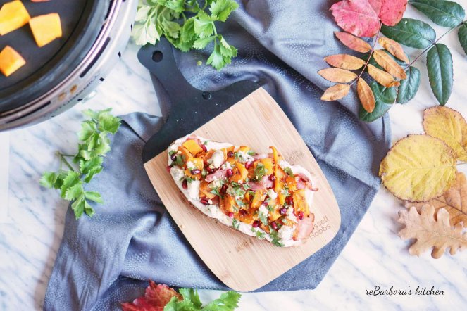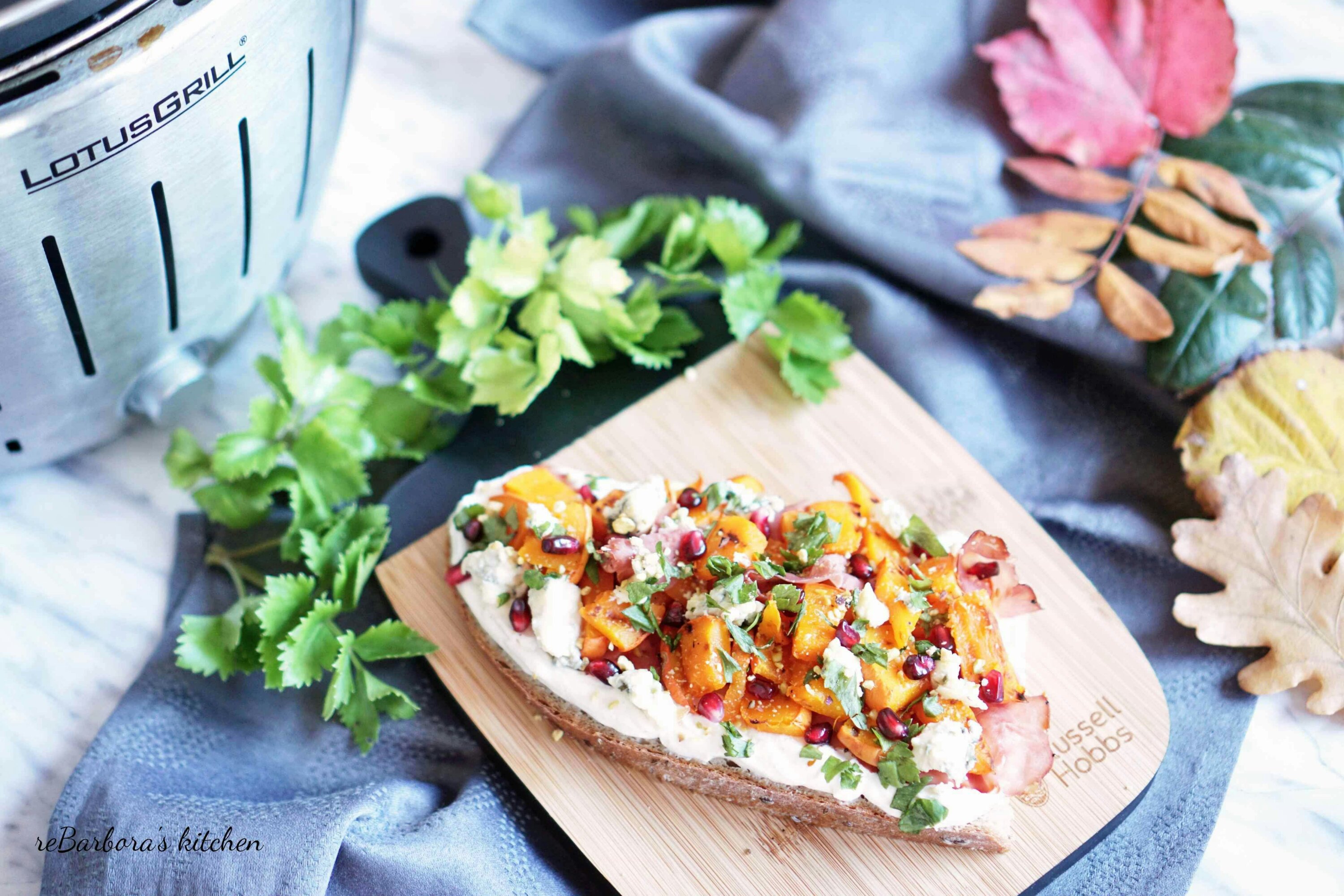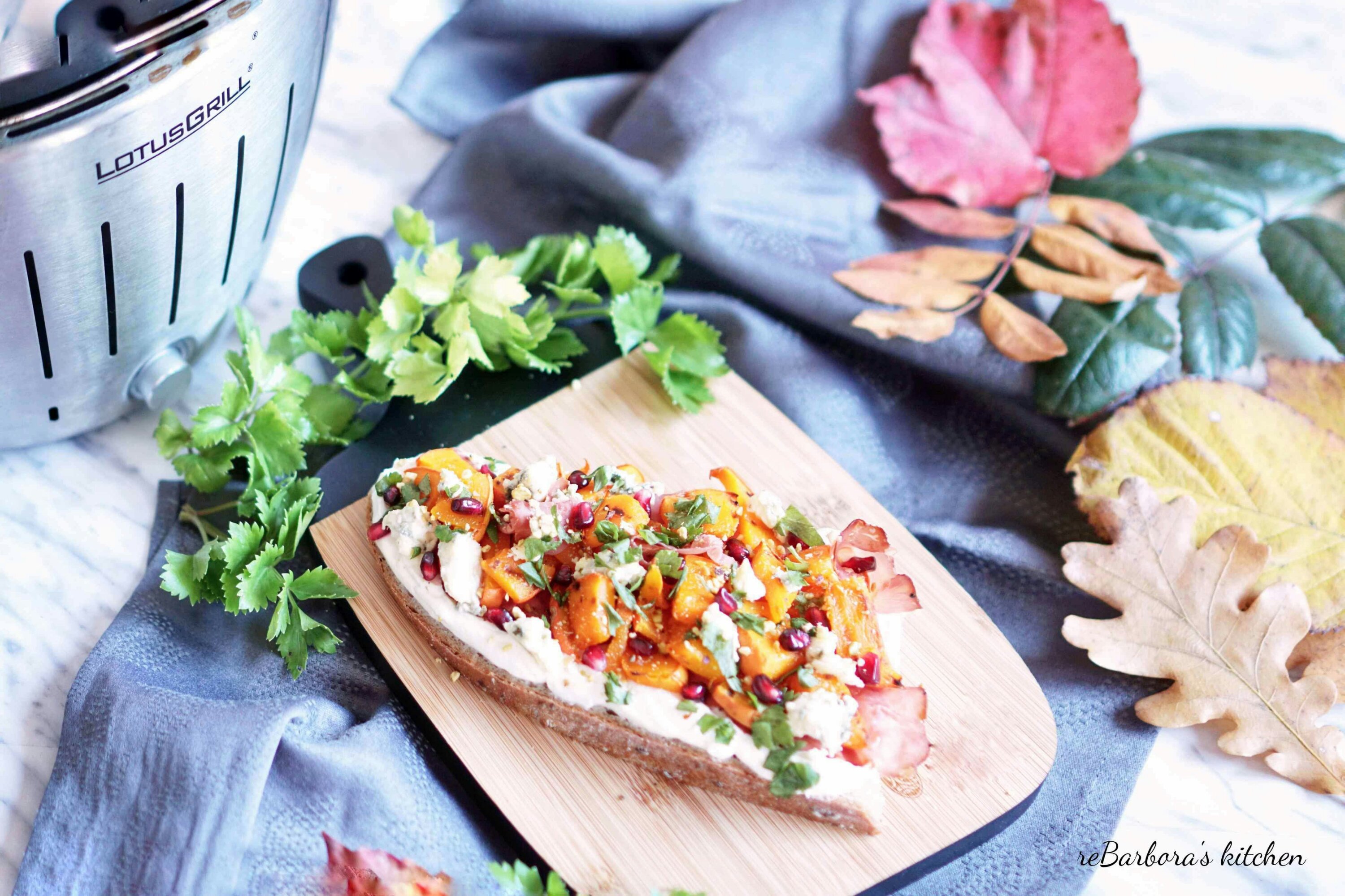 Já jsem tentokrát na Lotus grilu ogrilovala kostičky dýně a spolu s dalšími ingrediencemi je dala na toust, ale stejně tak můžete místo chleba dát zeleninu a udělat z těchto ingrediencí salát, báječná je i kombinace s bulgurem.