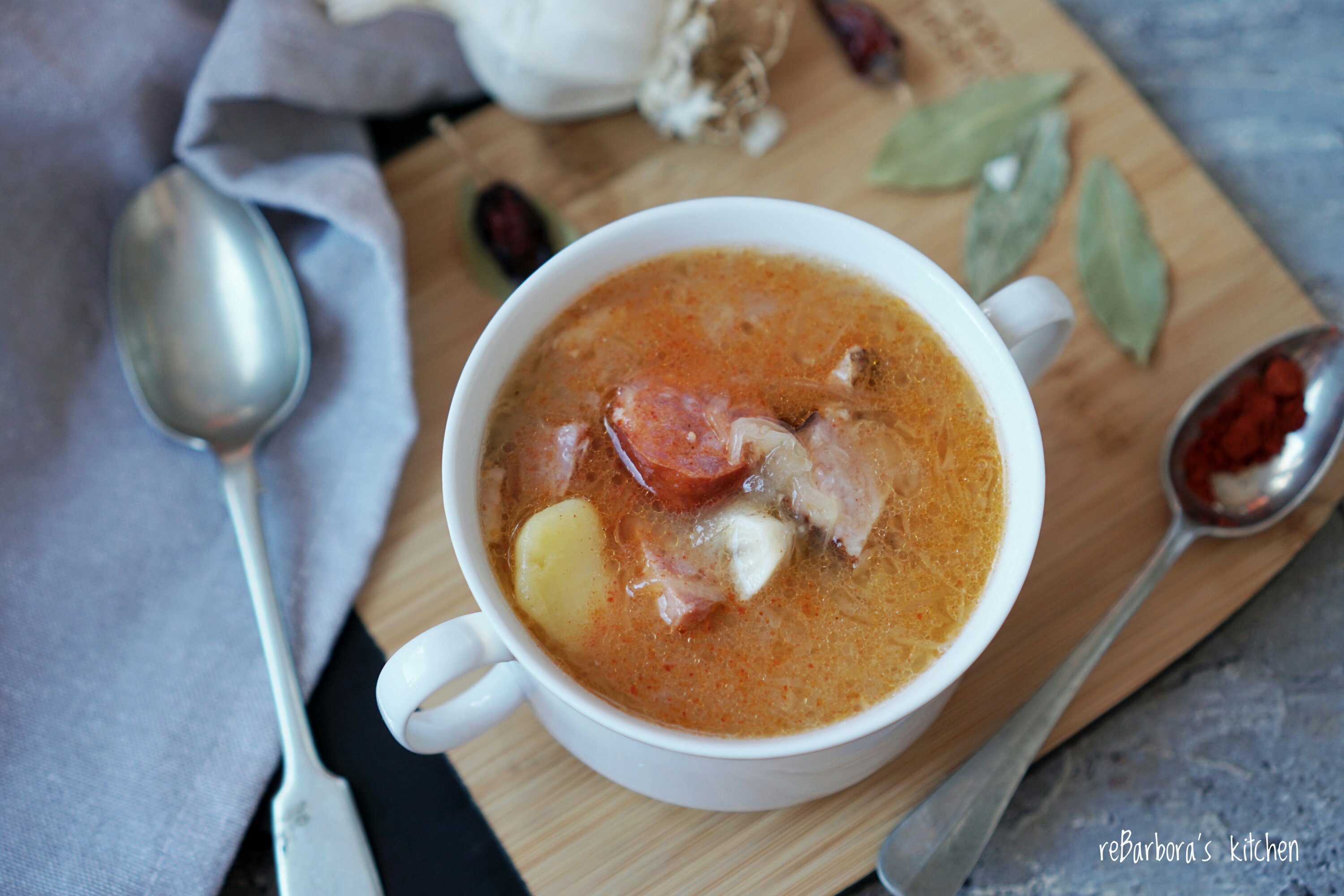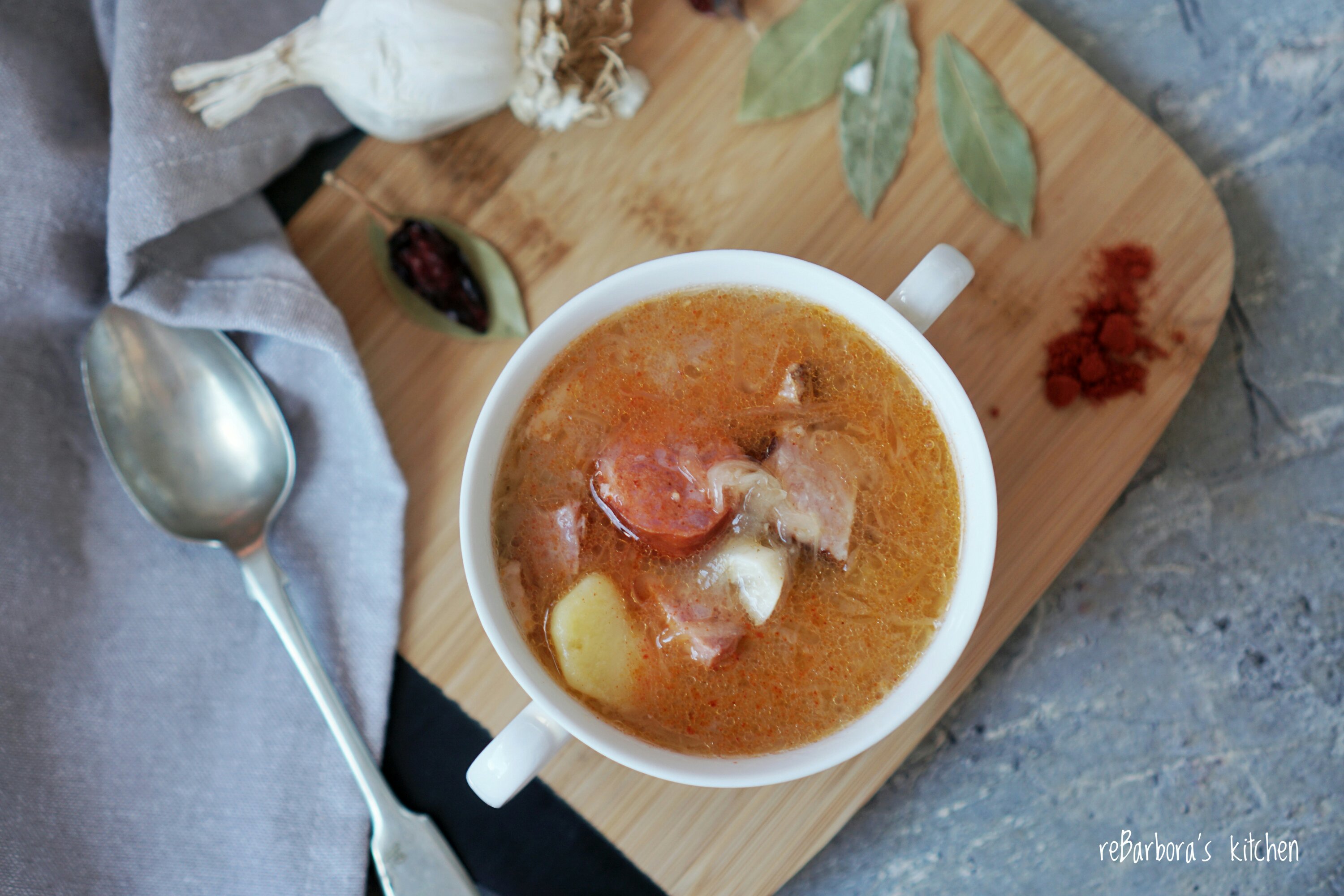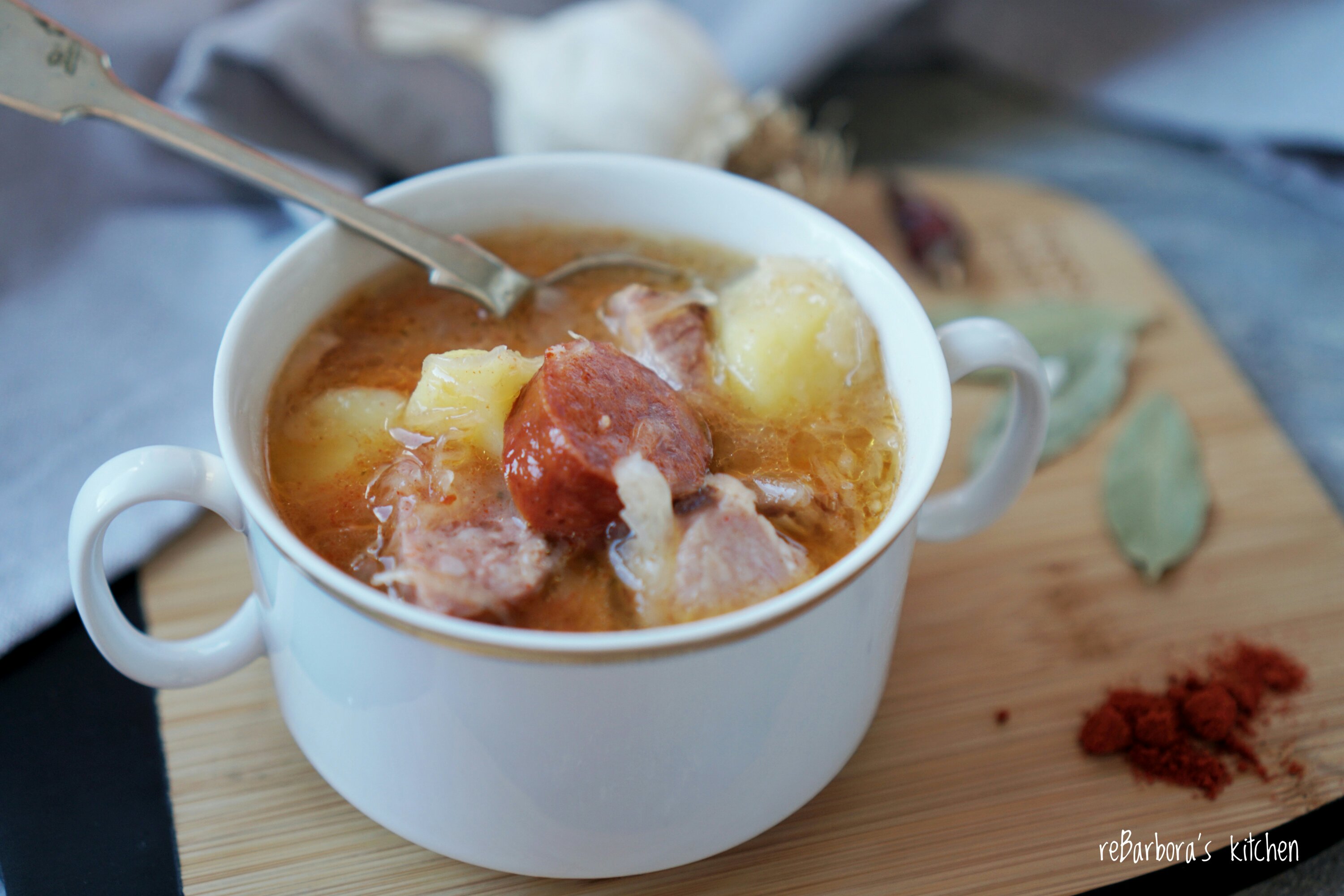 Náročnost: snadné Čas: cca 1 h Počet porcí: cca 6 Potřebujete: 500 g kysaného zelí (2 sklenky) 100 g uzeného masa 1 - 2 klobásy 3 - 4 brambory 1 cibuli 1 lžíci sladké (uzené) mleté papriky 2 lžíce hladké mouky 2 bobkové listy 1 lžička drceného kmínu sůl čerstvě mletý pepř 1,5 - 2 l vody nebo vývaru sádlo/máslo/nebo olej na restování cca 1 - 2 lžíce dle chuti cukr