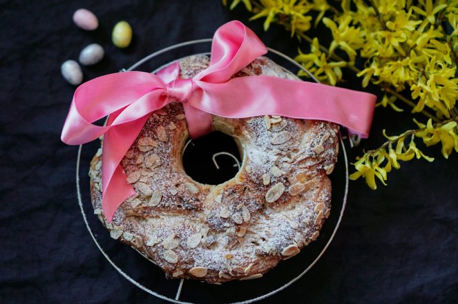 Po vykynutí těsto ještě trochu propracujte a rozdělte na tři – čtyři díly a vyválejte z nich delší prameny, z kterých zapleťte klasicky cop. Začátek nezaplétejte a nechte volný, na konci ho zapletete do druhého konce. Upletený cop stočte do kruhu (prostředek ať je volný) a konce zapleťte do sebe. Přemístěte na plech vyložený pečícím papírem a doprostřed vložte něco, by se vám těsto neslilo – např. hrneček, zapékací mističku, kulaté kovové vykrajovátko, případně smotaný alobal, vystlaný třeba čočkou. Povrch věnečku potřete rozkvedlaným vajíčkem, posypte plátky mandlí a nechte ještě přibližně půl hodinky na plechu kynout. Pečte 35 – 45 minut, po půlhodince můžete špejlí zkusit, zda už je upečený.