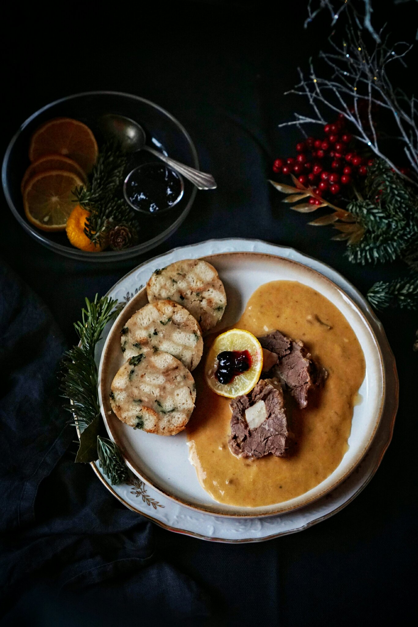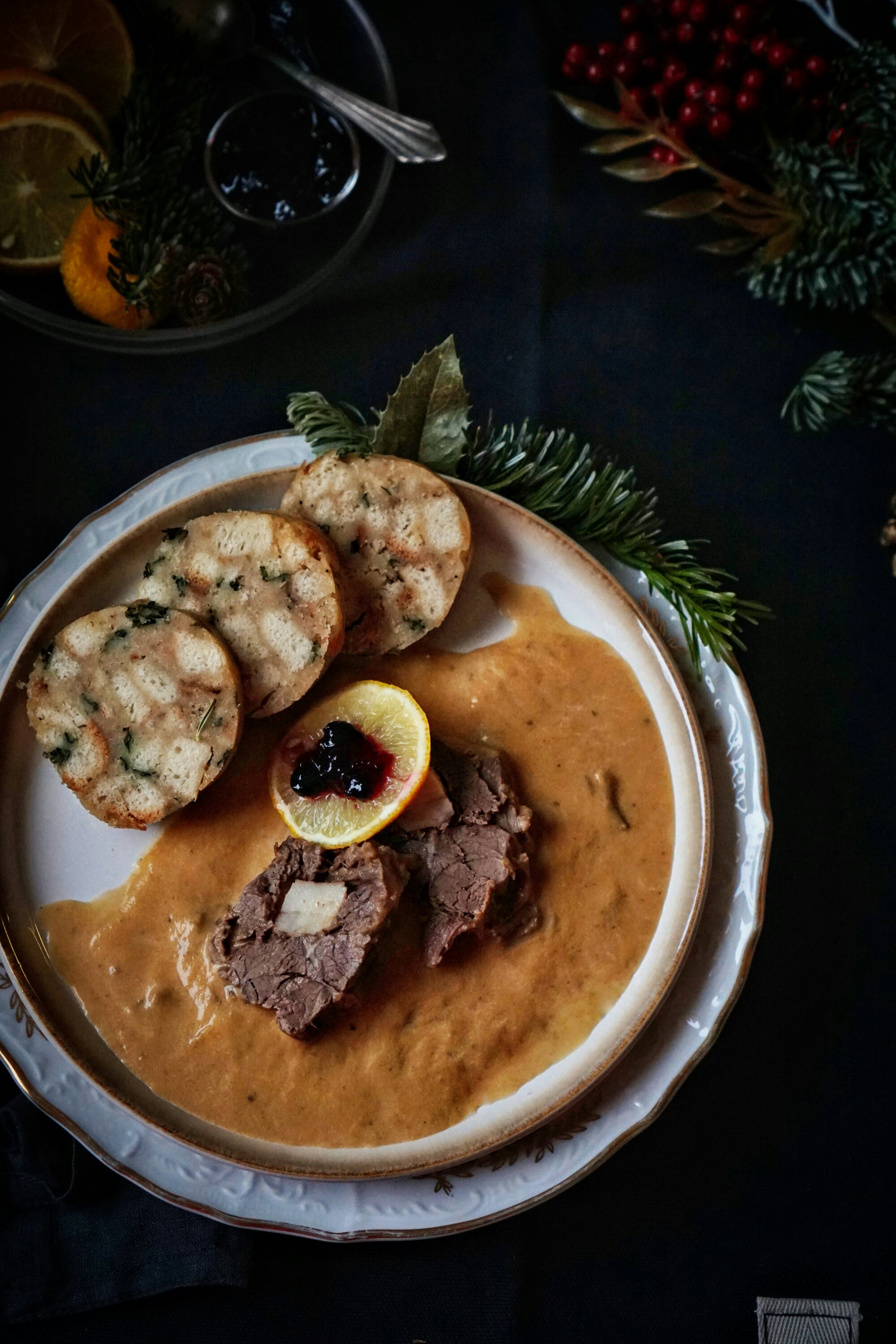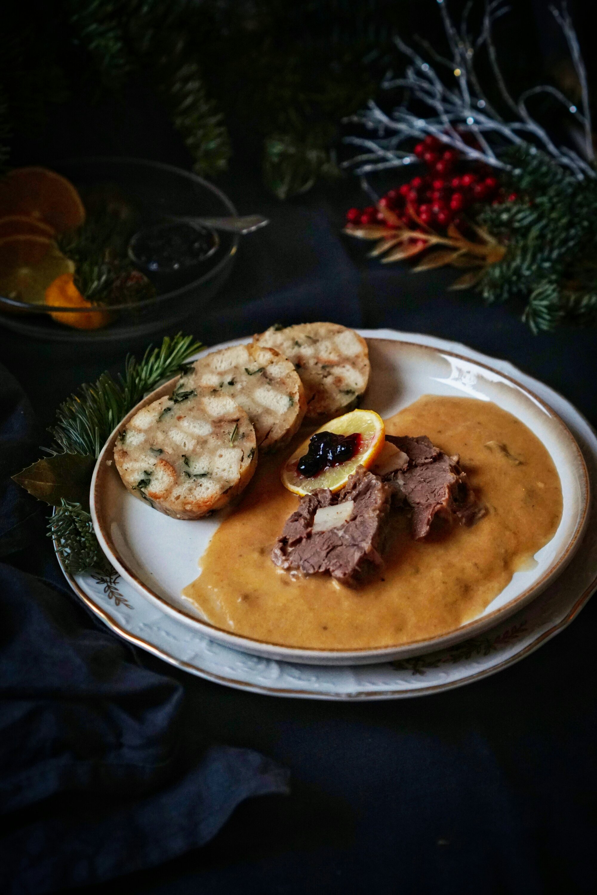 Ke svíčkové se často podává citron a brusinky, nebo i šlehačka. U nás se takto jí svíčková zcela minimálně. Tentokrát jsem ji tak ale servírovala, citron a brusinky jsem naservírovala na krásný nový skleněný talířek/misku, který mi nadělil Ježíšek z Bonami. Stejně tak svíčkovou jsem dala na momentálně můj oblíbený talíř od Ježíška z Bonami a užili jsme si krásně povánoční čas.