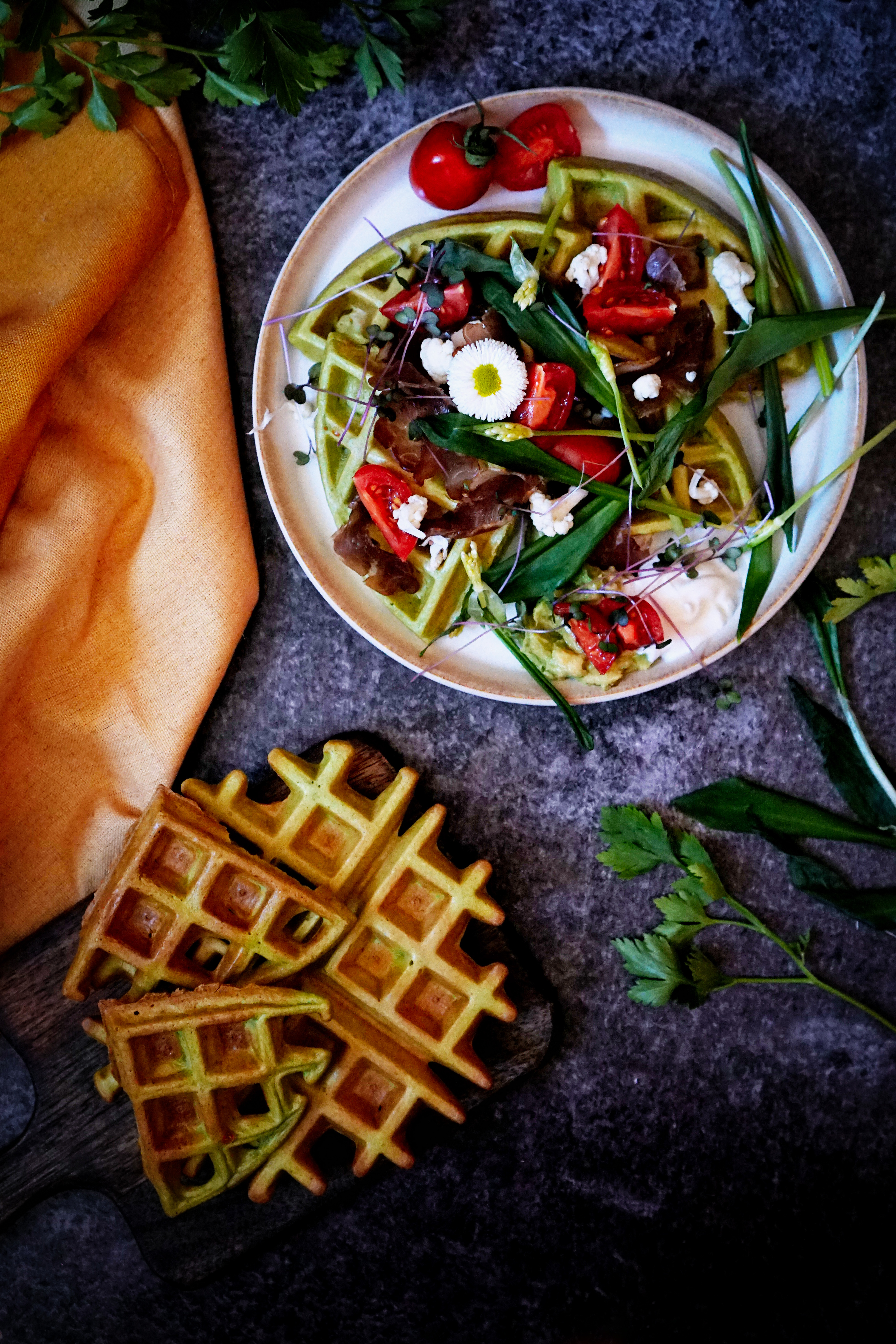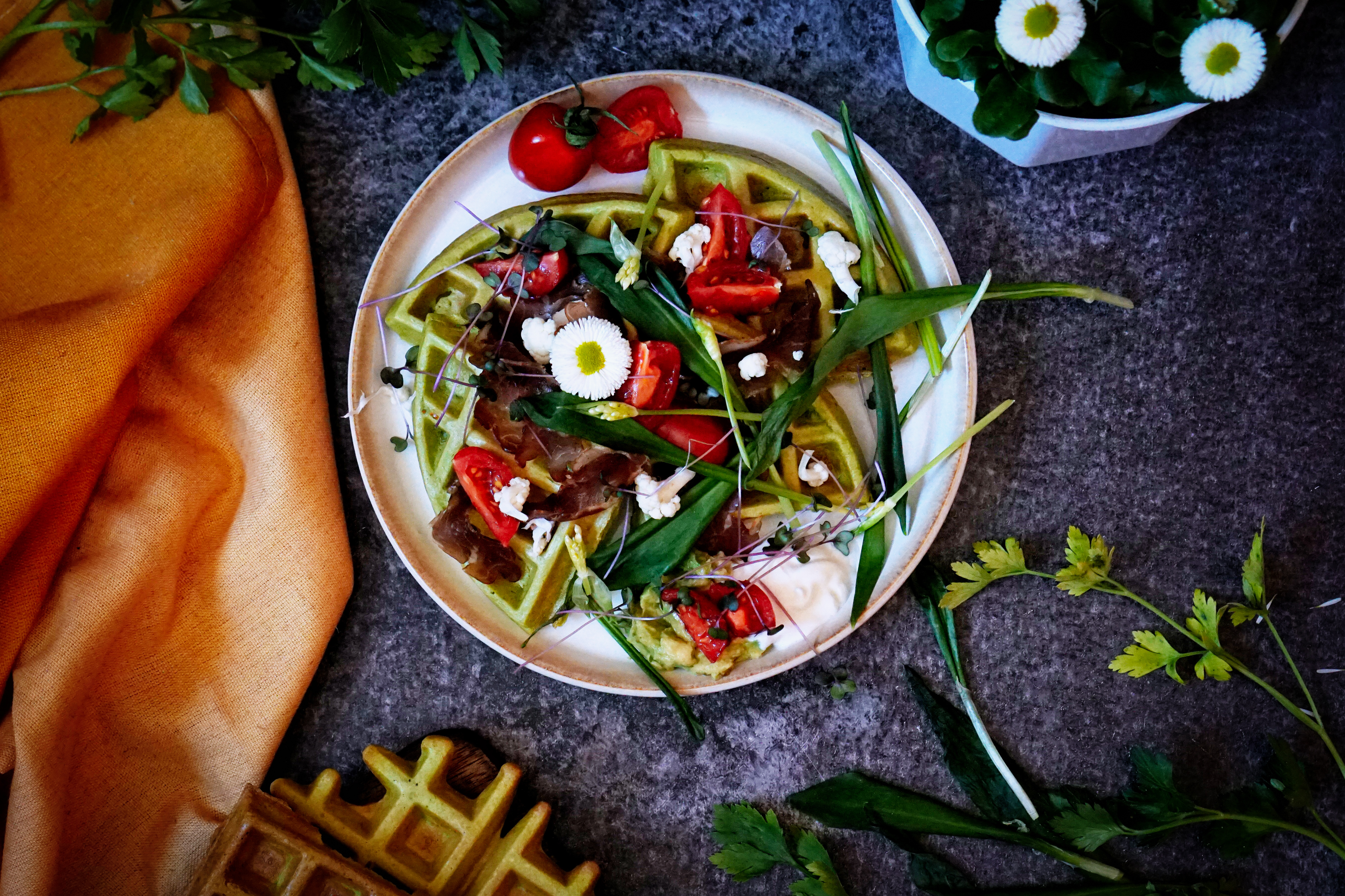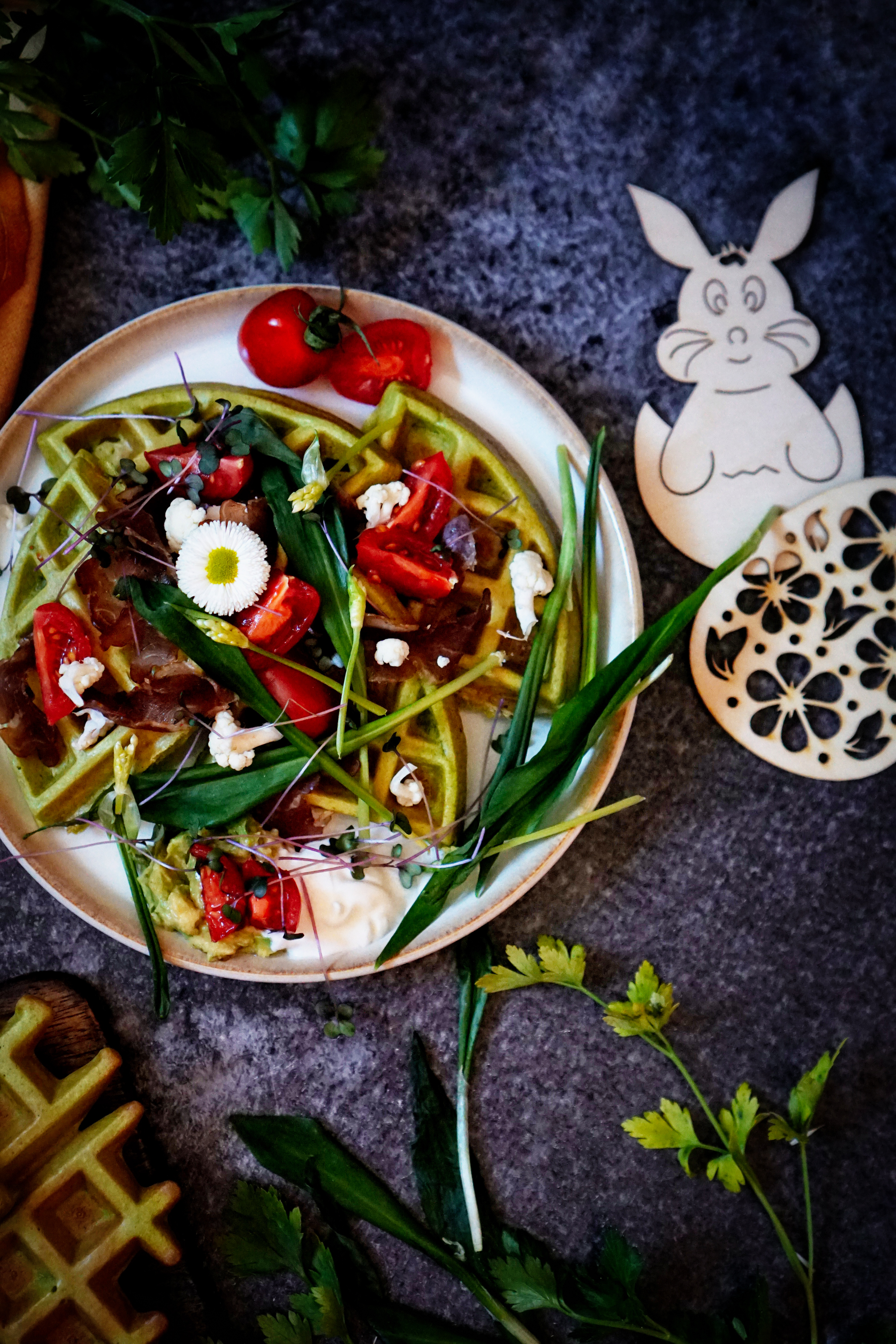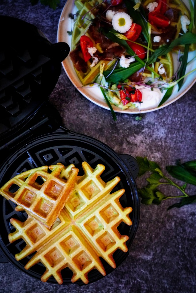 Ve Vajíčkové kuchařce jsem připravovala vafle sýrové, tentokrát jsem ale využila sezóny mého milovaného medvědího česneku a připravila jsem vafle z něj. Obložila jsem pršutem, čestvou zeleninou, rozmačkaným avokádem a jogurtem a byla z toho svěží jarní večeře.