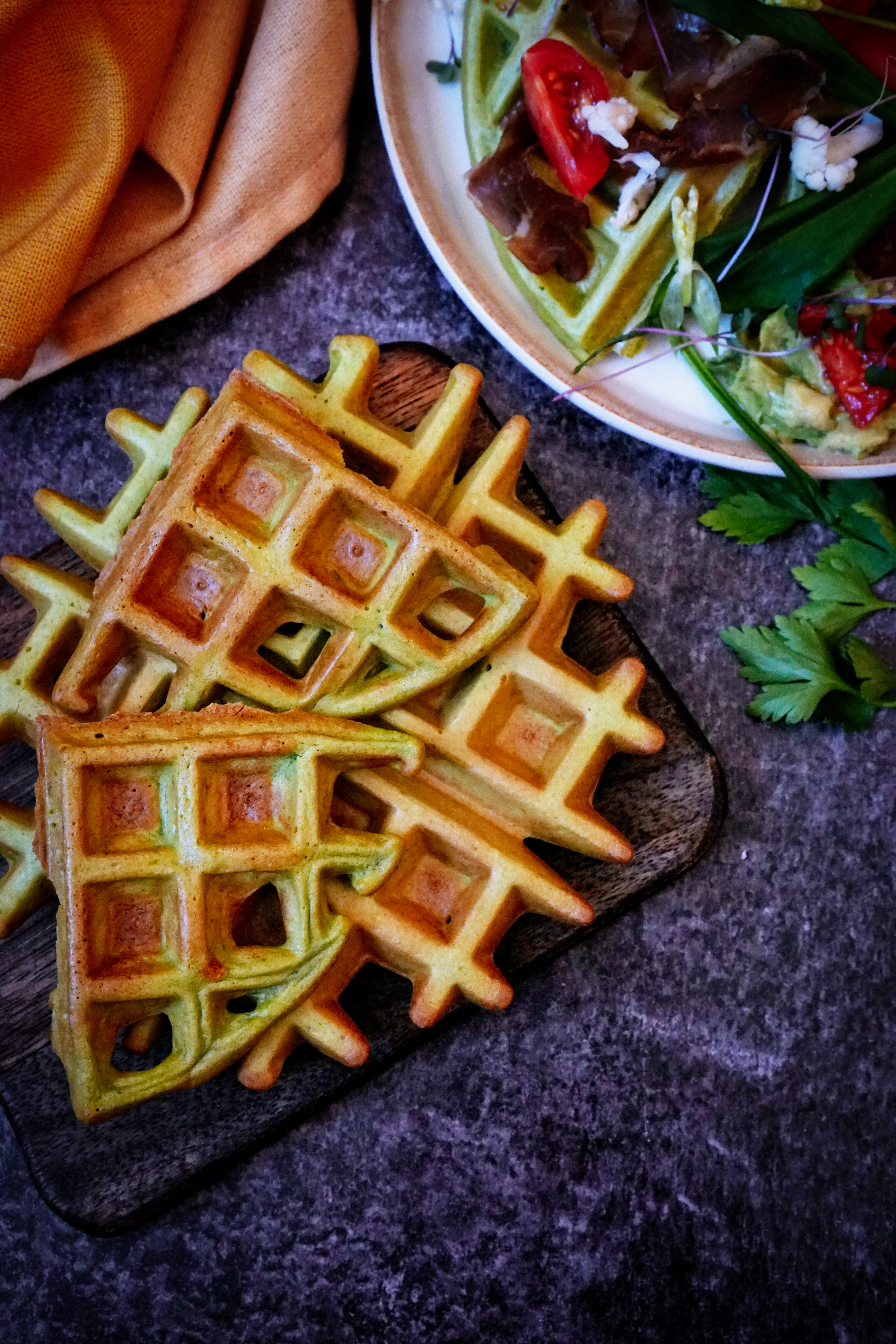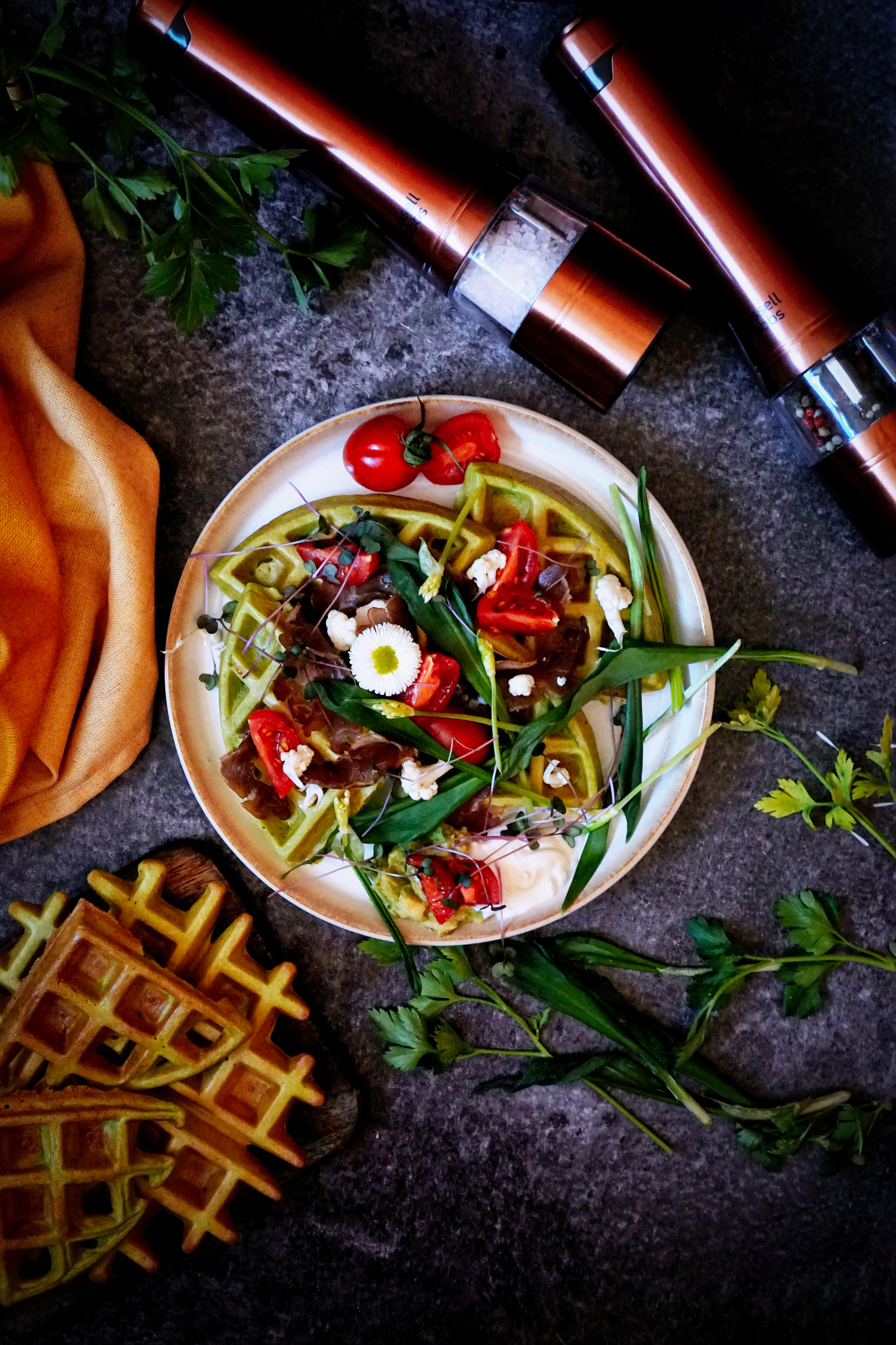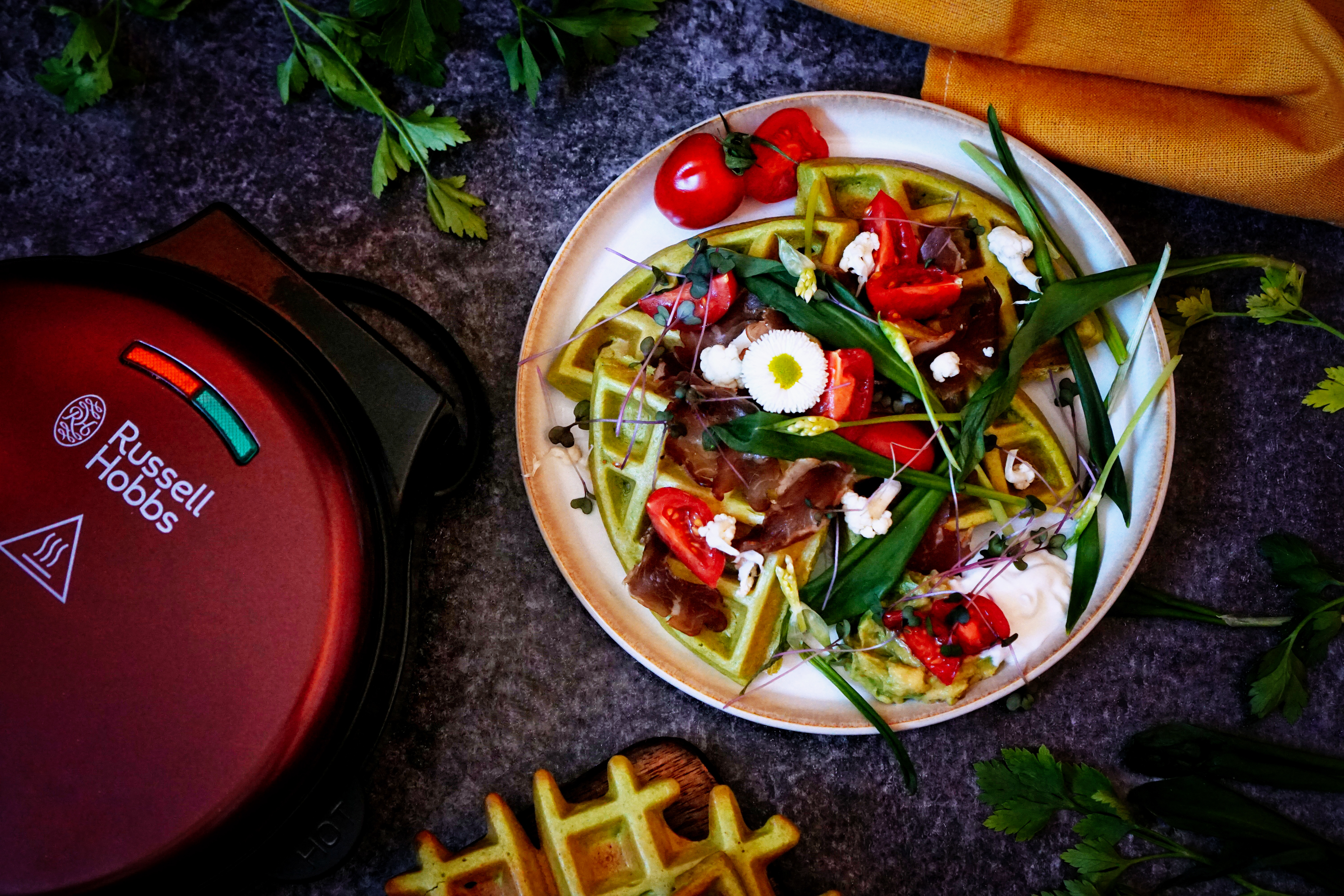 Ve Vajíčkové kuchařce jsem připravovala vafle sýrové, tentokrát jsem ale využila sezóny mého milovaného medvědího česneku a připravila jsem vafle z něj. Obložila jsem pršutem, čestvou zeleninou, rozmačkaným avokádem a jogurtem a byla z toho svěží jarní večeře.