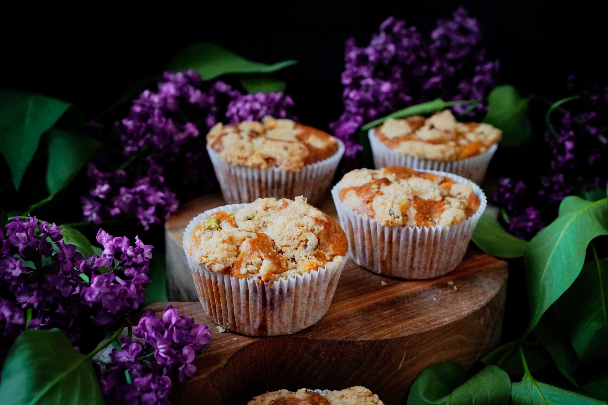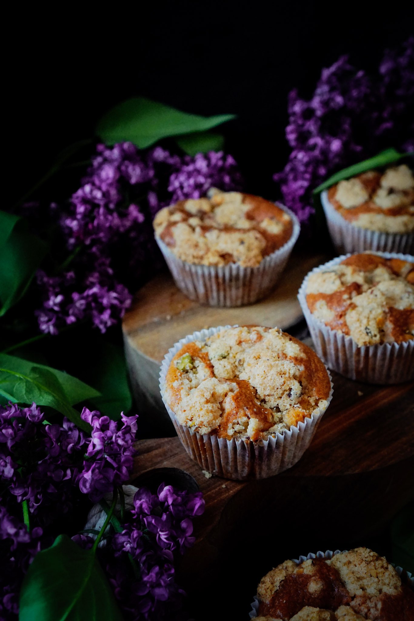 Těsto rozdělte v muffinové formě do papírových košíčků, posypte pistáciemi a poté drobenkou. Pečte do zezlátnutí, cca 20 – 30 min. Vyzkoušejte špejlí, zda už jsou muffiny hotové.