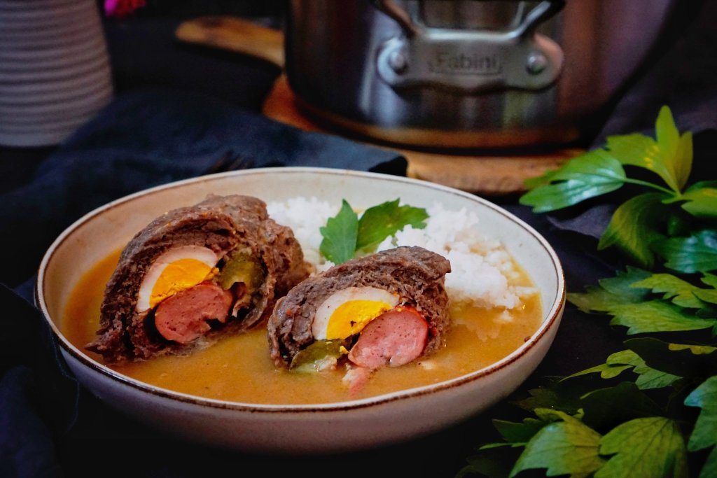 Maso naklepejte na tenčí plátky, z obou stran osolte a opepřete a na jedné straně potřete hořčicí. Na potřenou stranu dejte párek, okurku, proužek špeku a půlku vajíčka. Zarolujte jako klasický závitek a převažte potravinovou nití.