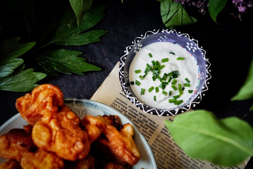 Zakysanou smetanu smíchejte s nastrouhaným čerstvým nebo rozmačkaným pečeným česnekem a dle chuti osolte a opepřete. Můžete přidat i čerstvou nasekanou pažitku.
