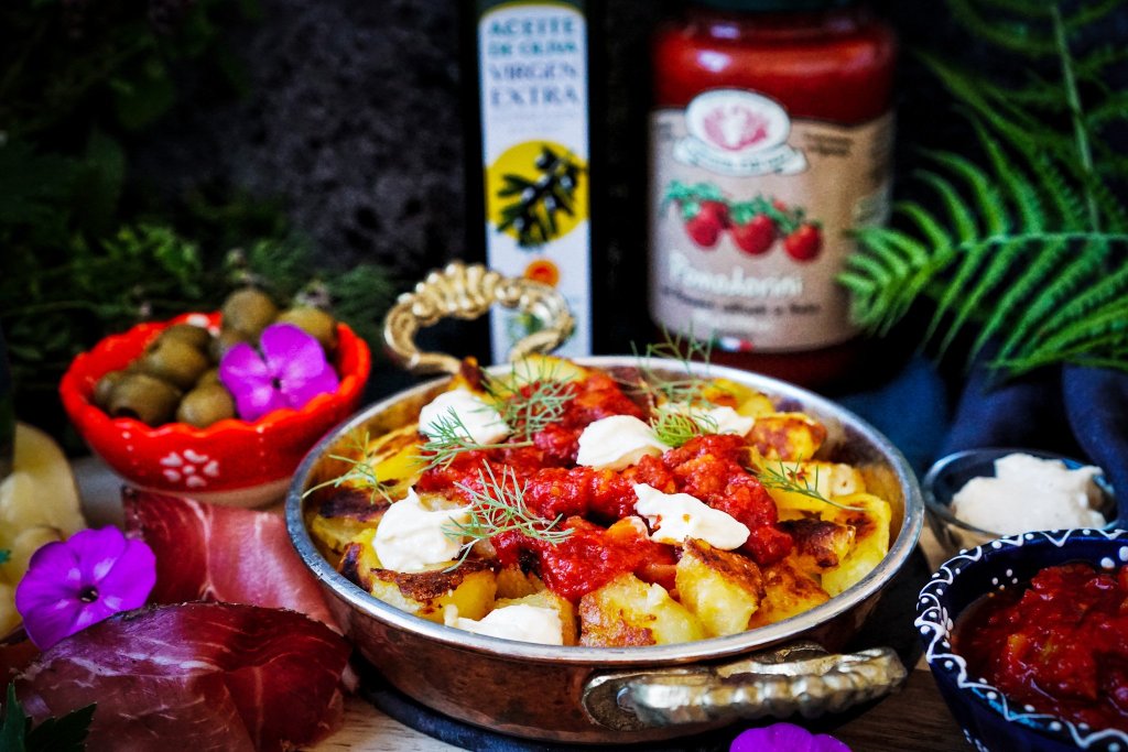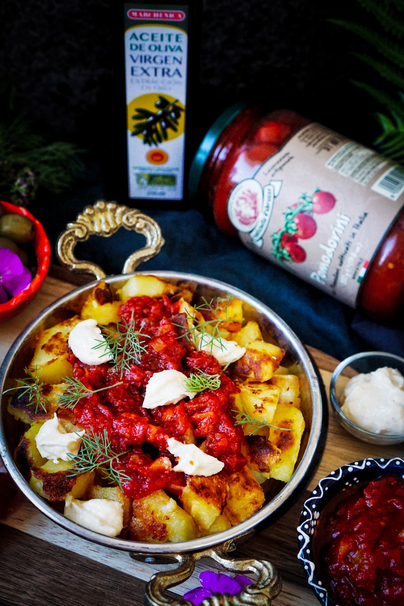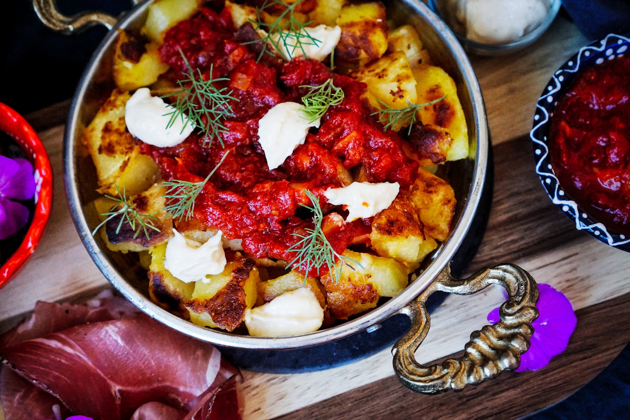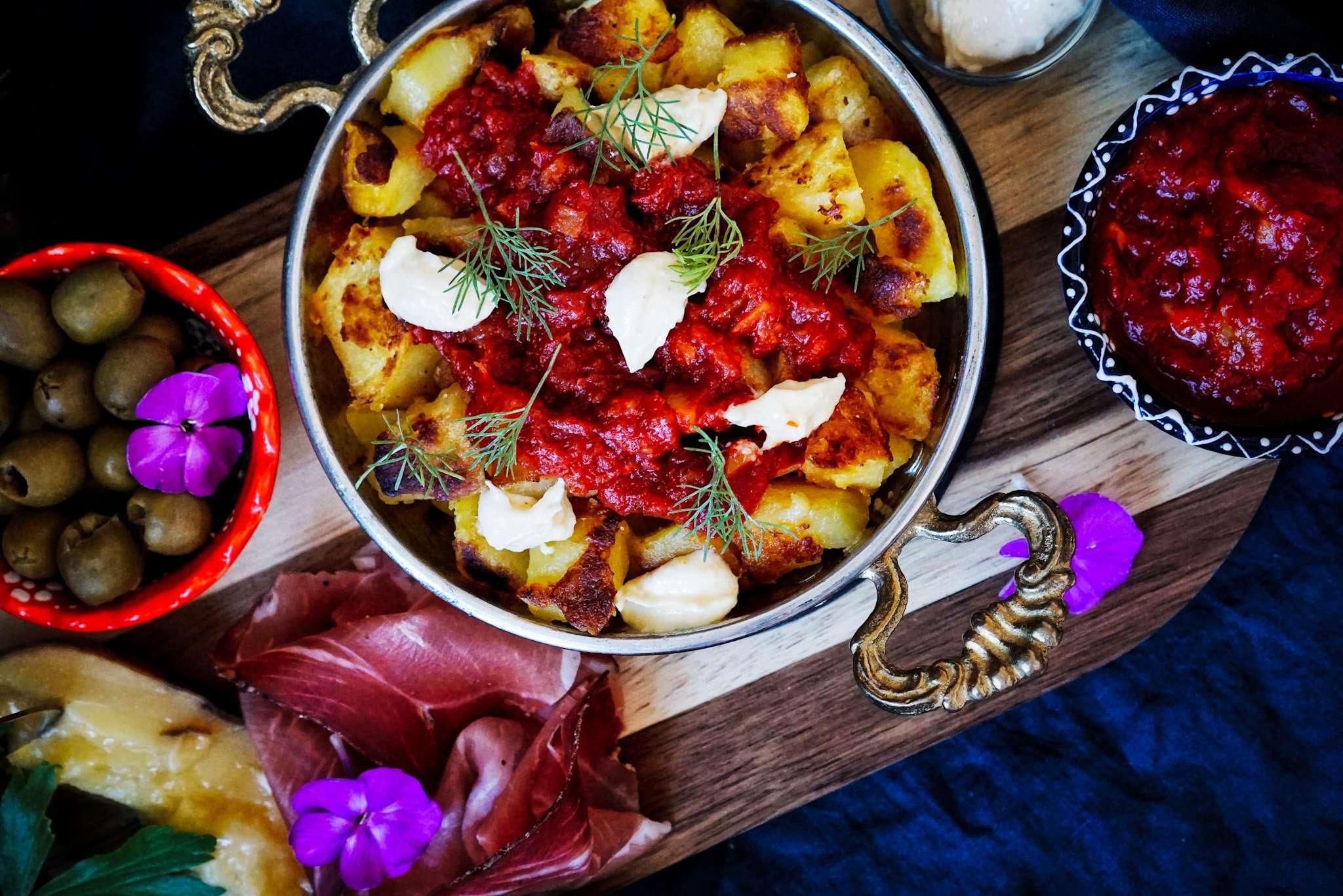 Součástí španělských tapas taky bývá, pro nás možná trochu netypický, pokrm z brambor patatas bravas, tedy pikantní brambory. Jsou opečené brambory, které se podávají s pikantní rajčatovou omáčkou a česnekovým dipem. Hodí se k nim sušená šunka, např jamón a sklenka červeného vína.