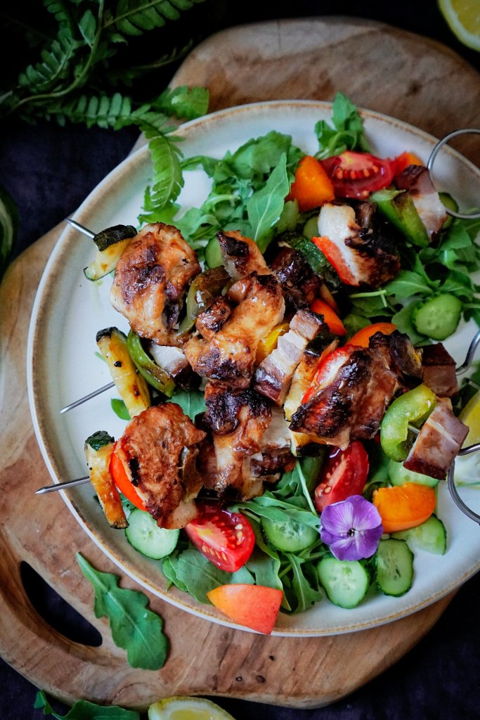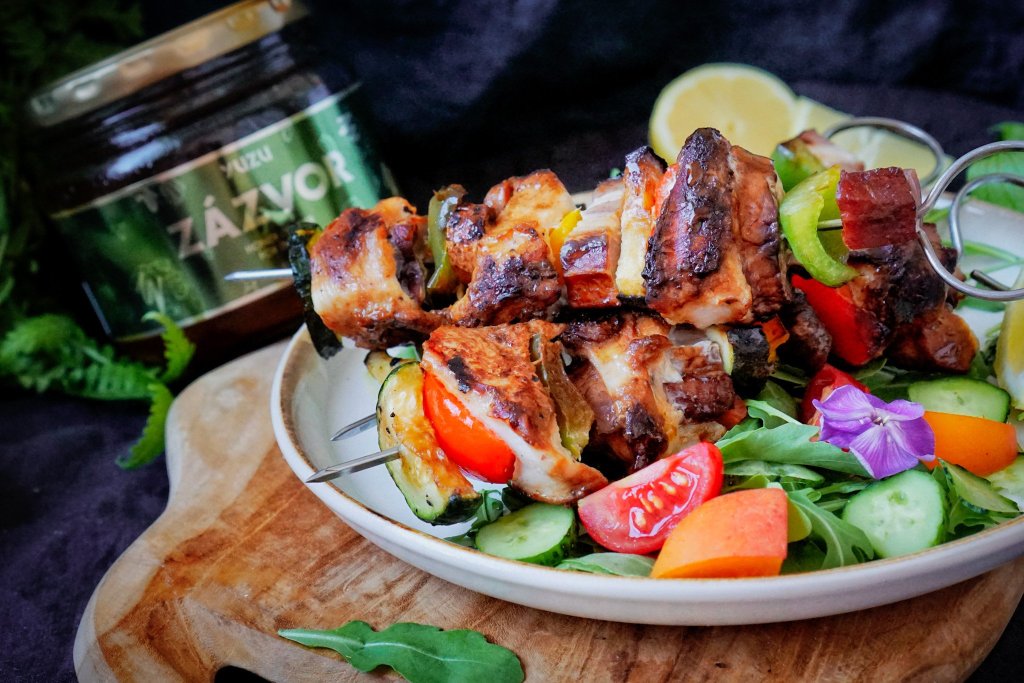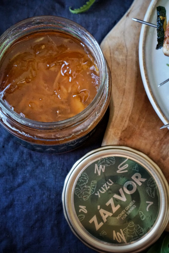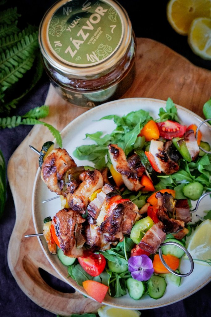 Zázvorovo-citrusová marináda je úžasně svěží, na léto ideál, ale nejen na léto. Do marinád ráda dávám med, tentokrat jsem jej ale vyměnila za Yuzu Zázvor a byla to pecka! Ke špízům jsem udělala salát z rukoly, rajčat, okurky a meruněk, nakonec jsem přidala i bulgur, osolila, opepřila a zakápla olivovým olejem. Výborný je k nim i jemný jogurtový dip.