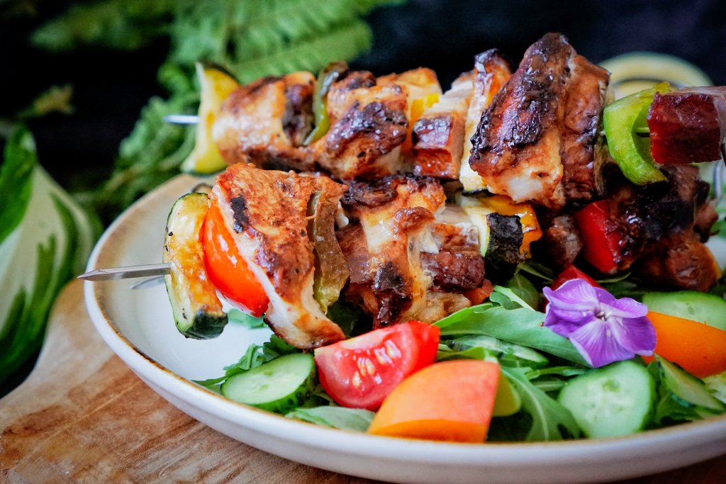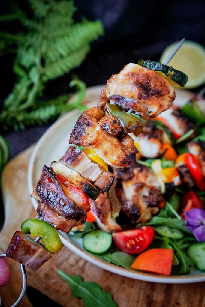 Ostatní ingredience nakrájejte na vhodně velké kousky a střídavě s namarinovaným masem napichujte na špejle. Ze všech stran ogrilujte, případně opečte v troubě či na pánvi.