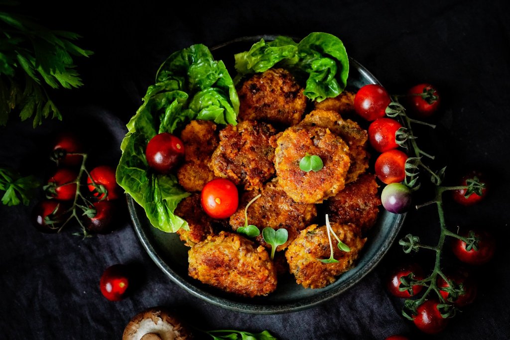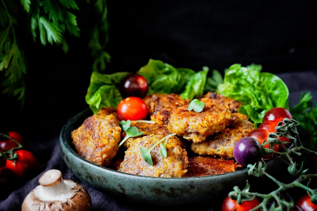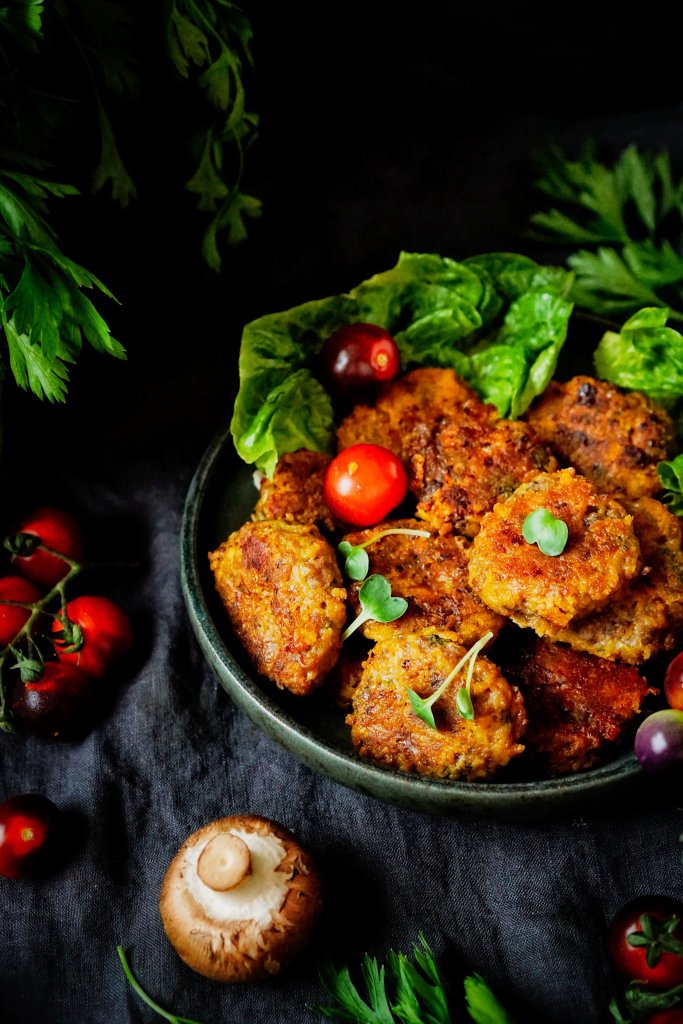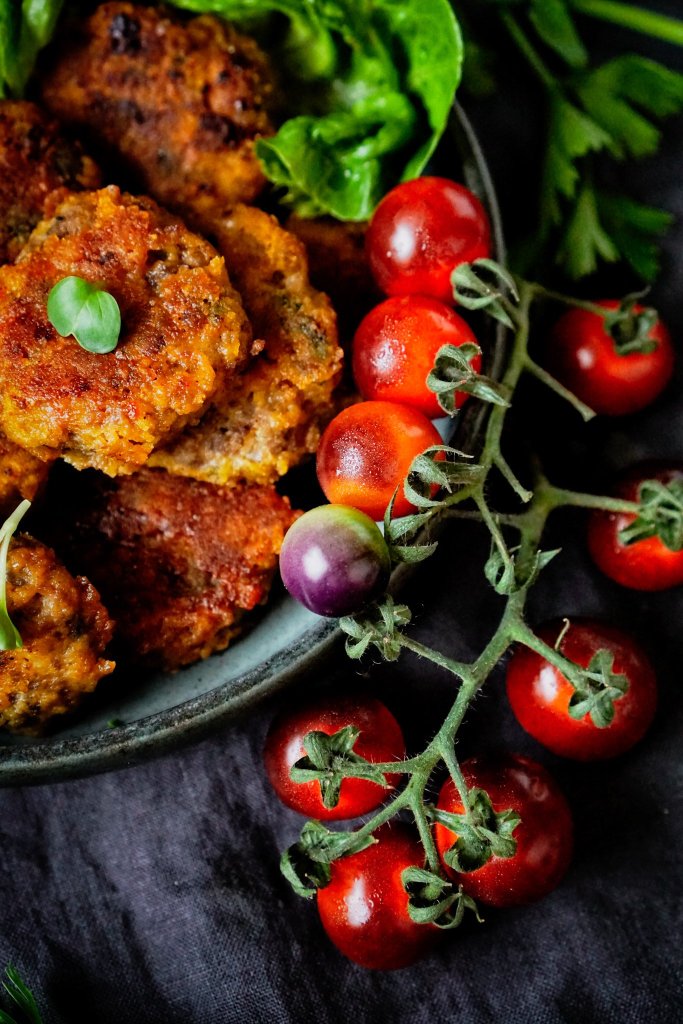 Karbanátky nemusí být nuda, do těchto jsem přidala ještě na jemno nasekané houby, které pozvednou chuť, nastrouhanou cuketu, která dodá parádní šťavnatost a ve stylu holandských řízků i sýr. Nakonec jsem je obalila v rozemletých kukuřičných lupínkách a smažila na ghíčku. Dobrota to byla! Podávala jsem k nim brambory na loupačku, zeleninku a jogurtový dip.