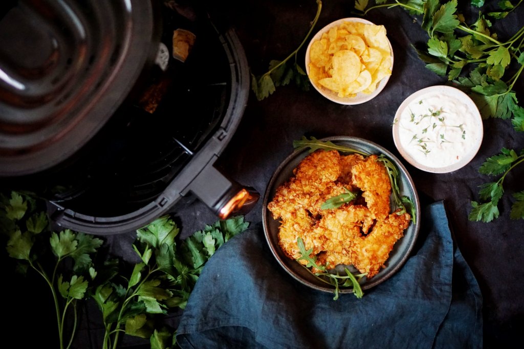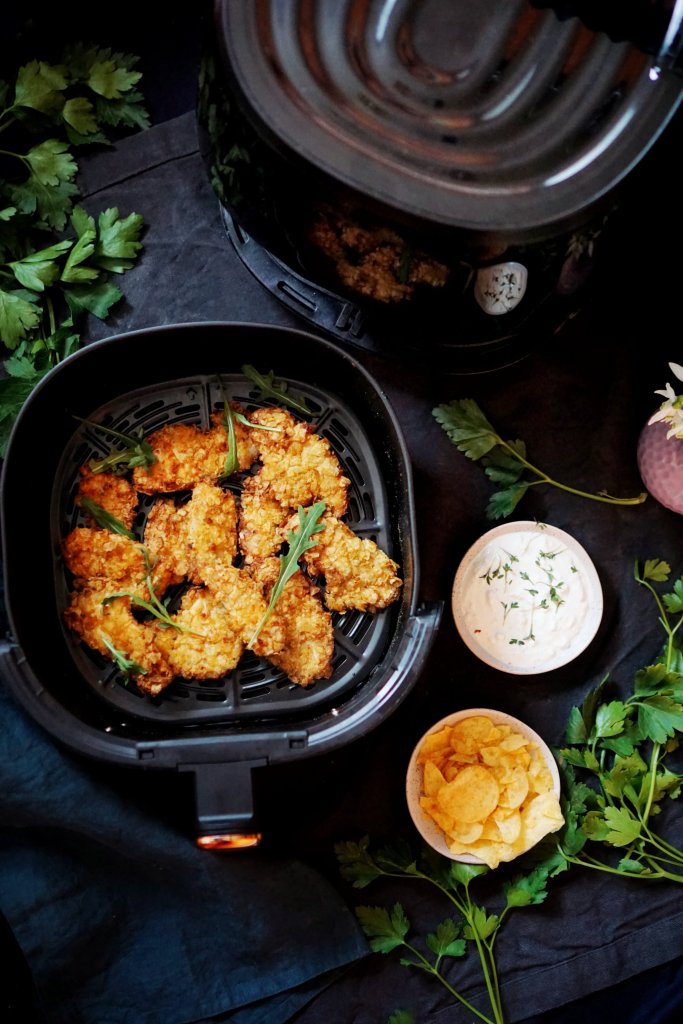 Obalené řízečky jsem tentokrát nesmažila, ale využila jsem horkovzdušnou fritézu. Odpadlo mi tak prskání oleje všude kolem, řízečky nasáklé tukem a zdlouhavé stání u sporáku.