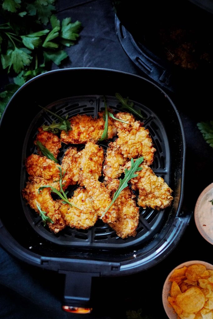 Kuřecí plátky namočte ve vejci a poté obalte v chipsech. Takto je vložte do horkovzdusné fritézy na rošt. Já fritovala na 200°C nejprve 6 minut z jedné strany a poté 6 minut i z druhé strany. Ale měla jsem opravdu tenké, na silnější řízečky čas přidejte. Vždy je lepší začínat na nižším čase, abyste si řízečky nepřepekli a podle potřeby přidat.