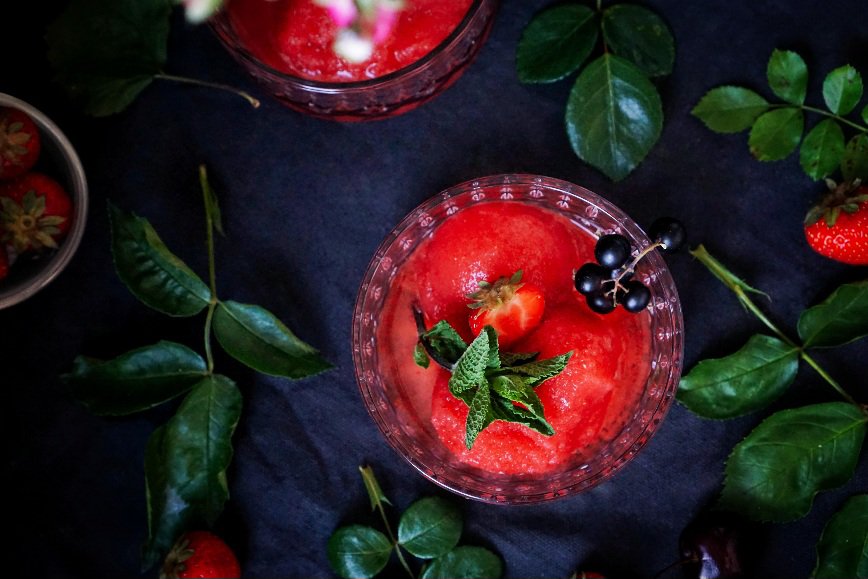 Očištěné jahody dejte do mixéru, přidejte cukrový sirup a šťávu z citronu a důkladně rozmixujte. Takto připravený sorbet přendejte do mrazáku a nechte napůl znrznout.
